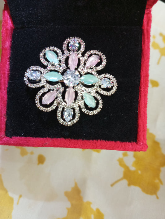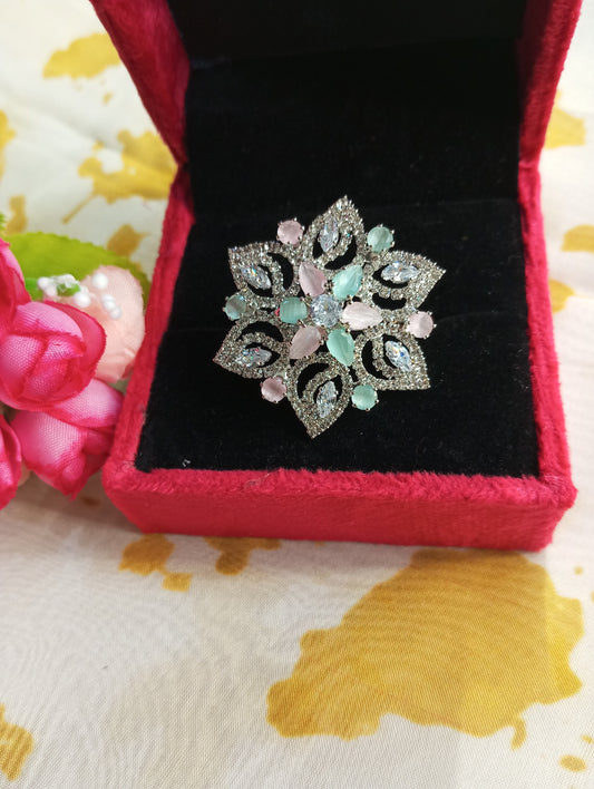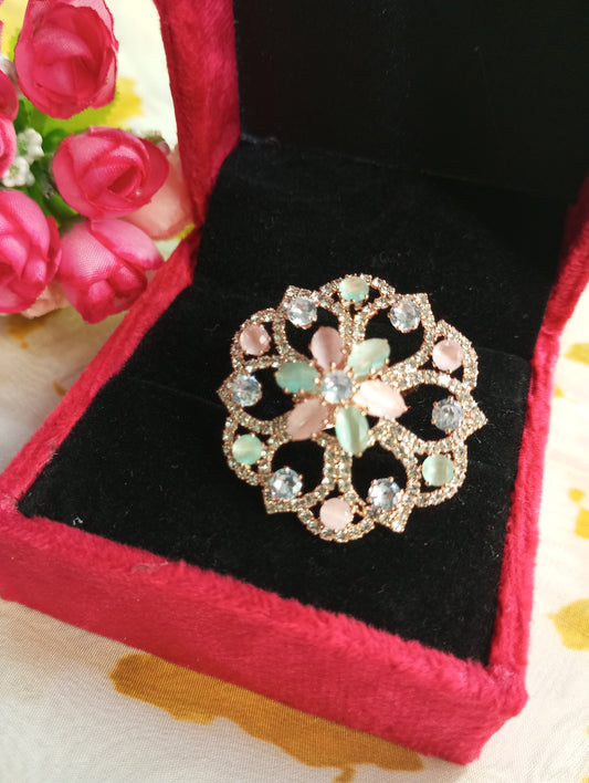 Adjustable American Diamond Cocktail Ring Flower- Pink and Mint Green Pastel Colors