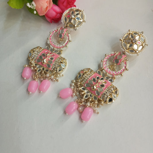 Mirror Work Ethnic Long Earrings- Baby Pink and Silver