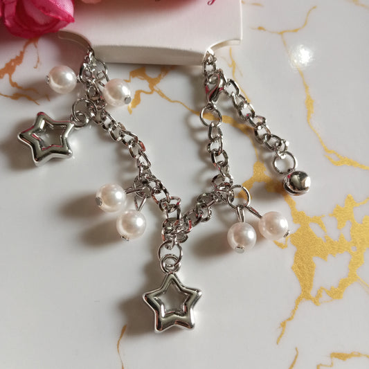 Silver Adjustable Bracelet- Hanging Pearls and Stars