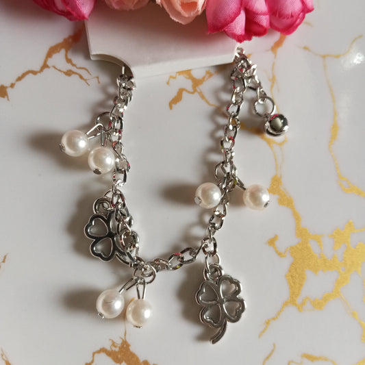 Silver Adjustable Bracelet- Hanging Pearls and Flowers