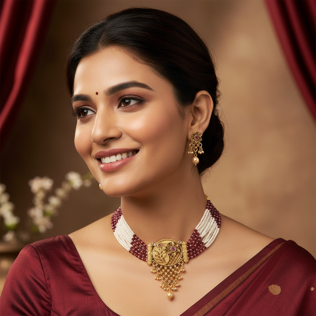 Discover the elegant Aamrani Choker Necklace Set, a stunning addition to any jewelry collection. This set features a beautifully crafted necklace with a matching set of earrings, perfect for completing any outfit. Made with quality materials, this set offers a timeless and sophisticated look.