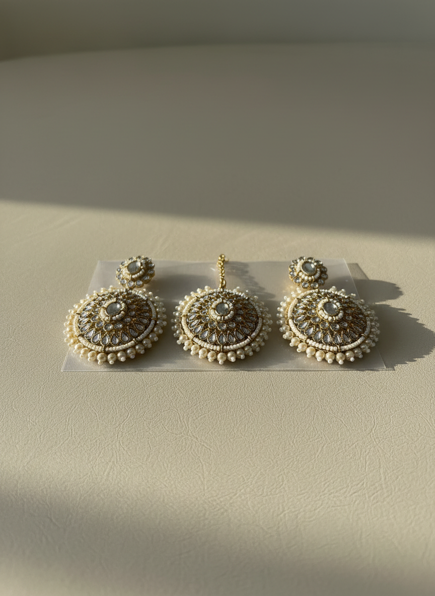 Enhance your look with our Earrings and Maang Tika set. Perfect for completing any outfit, these earrings add a touch of elegance and style. Made with quality materials, these accessories are sure to elevate your overall look.