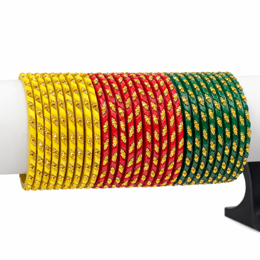 The Glass Stone Mix Bangle Set includes 3 dozen vibrant bangles in red, yellow, and green. These colors complement a wide range of ethnic outfits, enhancing overall appearance. The durable glass construction ensures longevity, while the variety of colors allows for versatile styling options, making them suitable for various occasions.