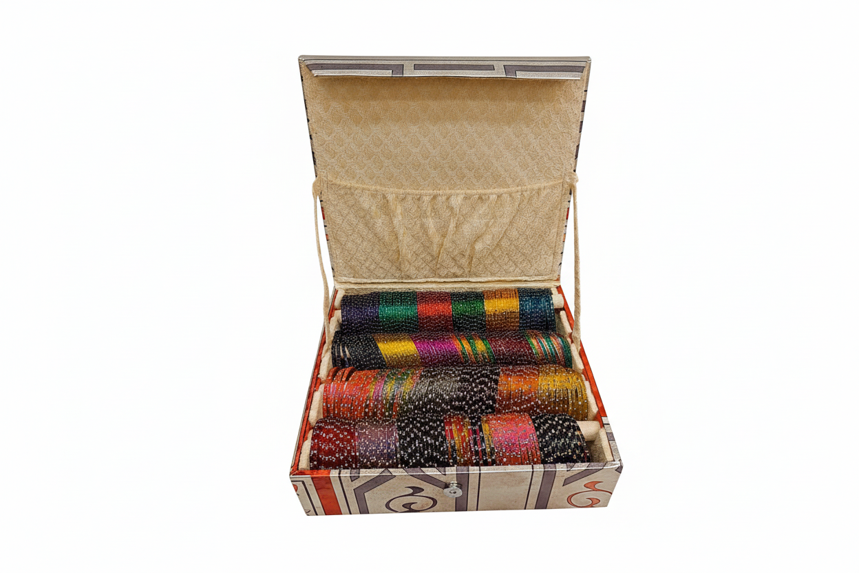 Organize and protect your collection of glass bangles with our Raindrop Glass Bangles Box. With a capacity of 24 dozen bangles, this box is perfect for storing and displaying your beautiful and delicate pieces. Safely store and easily access your bangles with our high-quality and expertly designed box.