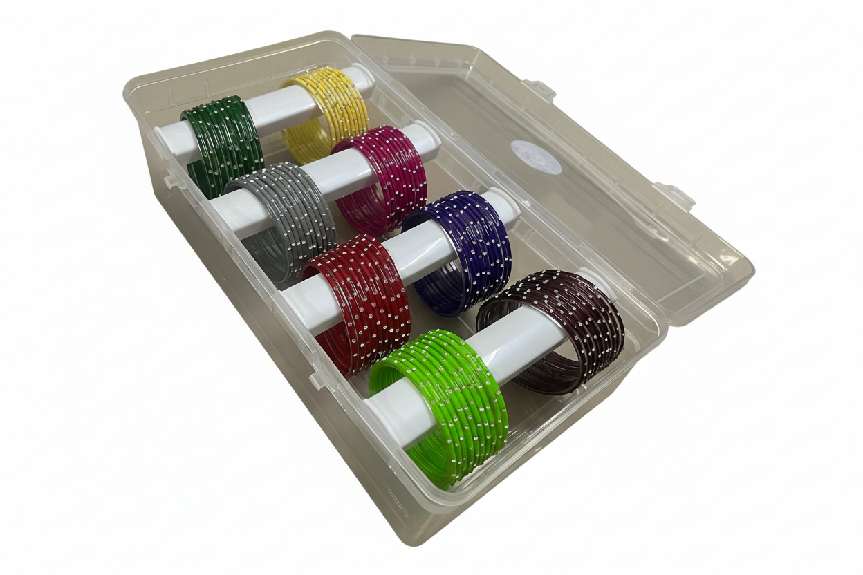 The Trending Glass Bangles Box contains 8 dozen glass bangles neatly organized in a durable 4-roll plastic box. This storage solution not only preserves the bangles' condition but also facilitates easy access and selection, enhancing organization and efficiency for users. The box offers a practical approach for both personal use and retail display.